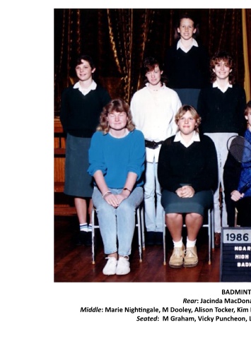BADMINTON, 1986 Rear: Jacinda MacDonald, Yvette MacDonald. Middle: Marie Nightingale, M Dooley, Alison Tocker, Kim Iremonger, Nicola Davison, Mr Sandy MacDonald [Tutor]. Seated: M Graham, Vicky Puncheon, Lisa Miller, Michelle Herdman, J Smith.
