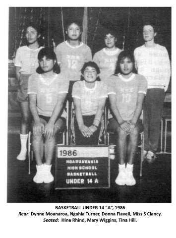 BASKETBALL UNDER 14 “A”, 1986 Rear: Dynne Moanaroa, Ngahia Turner, Donna Flavell, Miss S Clancy. Seated: Hine Rhind, Mary Wiggins, Tina Hill.