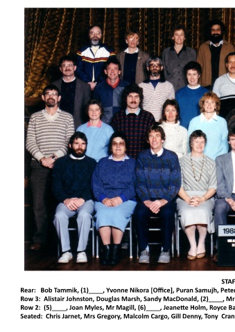 Rear: Bob Tammik, (1)____, Yvonne Nikora [Office], Puran Samujh, Peter Mans, Jessie Johnston, Mrs Harris, Trewyn Small.